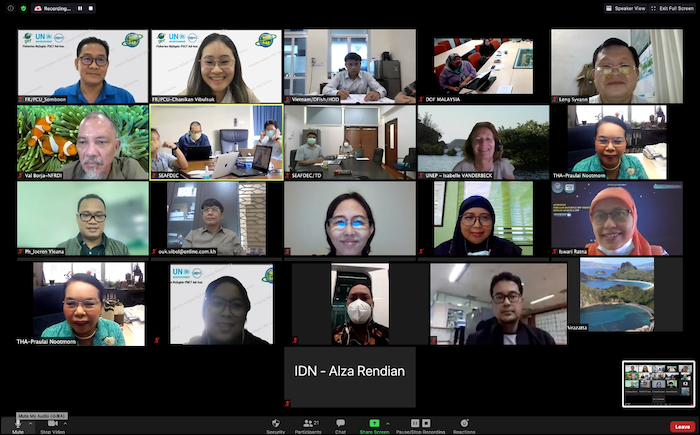 The SEAFDEC/Project Coordination Unit (PCU) organized the 7th Ad-hoc Meeting of the Project Steering Committee (PSC7 Ad-hoc) on 27 May 2022. The meeting is one of the regional programs under the SEAFDEC/UNEP/GEF Project on Establishment and Operation of a Regional System of Fisheries Refugia in the South China Sea and the Gulf of Thailand. As project steering committee members, all national focal points and the national scientific and technical committee attended the meeting. Ms. Isabelle Vanderbeck: the project task manager from UNEP, Mr. Isara Chanrachkij, Head of Project Planning and Management Division from SEAFDEC Training Department, and Mr. Worawit Wanchanna, Policy and Program Coordinator from SEAFDEC Secretariat, also attended the meeting. The meeting updated the progress of national and regional activities, especially on the establishments of the fisheries refugia, legislation/fishery law reform in supporting the management of established fisheries refugia, the adoption of the regional guidelines on indicators for sustainable management of fisheries refugia, and financial and co-financing from partners. The meeting acknowledges the progress report, even though the COVID-19 pandemic impact for more than two years, from 2020 to early 2022, caused the project activities had been delayed in some countries.
