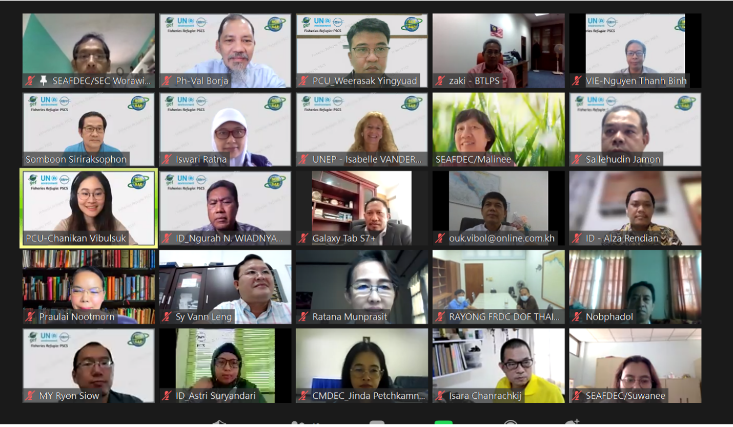 The Project Coordinating Unit (PCU) of the Fisheries Refugia organized the 5th Project Steering Committee (PSC5) Meeting on 3 September 2021 to update the work progress, including policy decisions to support the project’s implementation, financial and budget plan for 2022. The meeting is a virtual meeting via Zoom Platform. Fifty-seven participants from 6 participating countries, including SEAFDEC senior officers, project Task Manager from UNEP, and the PCU staff, attended the meeting.